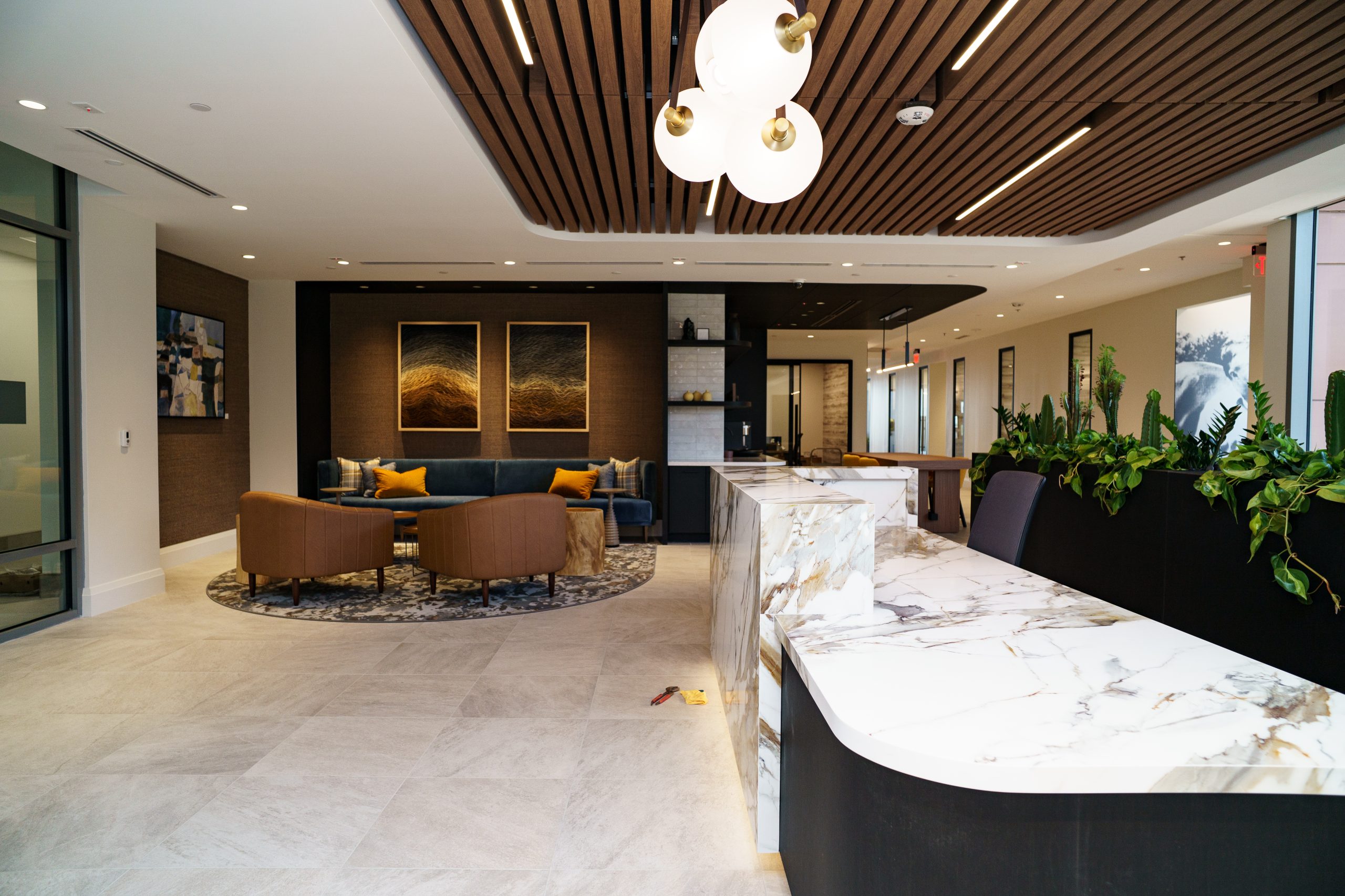 This 8,500 SF tenant improvement project delivered a premium Class A office environment for a national client’s new concept. Brien Contracting transformed grey space into a sophisticated workplace featuring extremely high-end finishes and precise detailing to bring the vision to life. The project faced permitting delays and an extremely tight schedule, requiring careful coordination with client vendors and strict adherence to timelines. Located on the building’s third floor, the work was executed without disturbing neighboring tenants in active operation—showcasing our team’s ability to balance luxury quality with logistical precision.